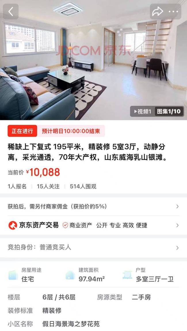 4月7日,河北凡亮拍卖有限公司在京东资产交易平台上发布公告称,定于4月18日10时至4月19日10时止(延时除外),对位于山东威海乳山的一处“稀缺上下复式”房产进行公开拍卖。标的描述为“195平方米、精装修、5室3厅、70年大产权”,并注明“步梯房、无供暖无产权纠纷、不存在交付困难等问题”。起拍价10088元,保证金2万元,加价幅度100元或其整倍数。