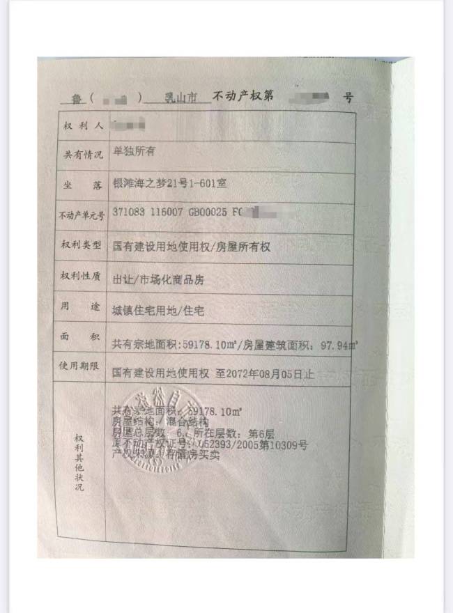 根据不动产权证,该套房屋位于山东威海乳山市银滩海之梦,第6层(总层6层),权利类型为“国有建设用地使用权/房屋所有权”,权利性质为“出让/市场化商品房”,用途为“城镇住宅用地/住宅”,登记建筑面积97.94平方米,国有建设用地使用权至2072年8月5日。 1
