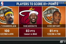 北京时间3月11日,阿德巴约在热火大胜奇才的比赛中砍下83分,超越科比尘封20年的81分得分纪录,仅次于张伯伦单场100分。