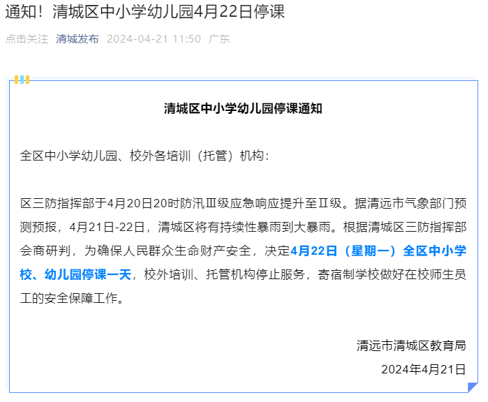 21世纪经济报道 广东二十一世纪经济报道报社有限公司 2024年04月21日 22:03 广东 4月18日以来,广东省大部降暴雨到大暴雨,局地特大暴雨。受其影响,北江等多条河流发生超警洪水,山洪和地质灾害多发,部分城镇局地出现内涝。 广东多地:4月22日中小学校、幼儿园停课 清远市清城区 ↓↓ 清远市佛冈县 ↓↓ 清远市清新区 ↓↓ 清远市英德市 ↓↓ 清远市阳山县 ↓↓ 肇庆市怀集县 ↓↓ 4月22日,广东仍有强降水,周一返校前请密切关注当地暴雨预警信号。根据《广东省气象灾害防御条例》,当气象部门发布暴雨红色预警信号可视为停课信号, 具体信息以当地教育部门的通知为准。 44条河流发生超警洪水 据新华社报道,记者4月21日从水利部珠江水利委员会了解到,受4月16日以来持续性强降雨影响,珠江流域共有44条河流发生超警洪水,超警幅度0.01-7.04米,其中北江发生2024年第2号洪水。 据气象水文部门预测,流域中东部地区强降雨过程仍将持续,北江水位将继续上涨并可能发展成特大洪水,发生中小河流洪水和山洪地质灾害风险极大,流域防汛形势严峻复杂。 根据《珠江防汛抗旱总指挥部防汛抗旱应急预案》有关规定,珠江防总决定于4月21日8时将防汛Ⅲ级应急响应提升至Ⅱ级,珠江委同步将洪水防御Ⅲ级应急响应提升至Ⅱ级。 据珠江委相关负责人介绍,当前流域防汛形势不容乐观,珠江委将加密雨水情监测预报,滚动会商研判,强化洪水调度预演,逐江河、逐区域研判防御风险,针对性制定防御方案,并督促指导地方做好中小河流洪水和山洪灾害防御,中小水库、病险水库、在建工程安全度汛等工作,提醒地方及时转移受威胁区域人员,全力确保人民群众生命财产安全。 目前,珠江防总已向广西、广东、福建等省份发出通知,指导督促各有关单位进一步压紧压实防汛责任,加强监测预报预警,科学调度运用好各类水工程,充分发挥水库拦洪削峰错峰作用,提前做好蓄滞洪区运用准备,提前组织危险区人员转移撤离,全力确保人民群众生命财产安全和社会大局稳定。 来源: 新华社、 南方都市报(nddaily) 本期编辑 刘雪莹 实习生 李洁