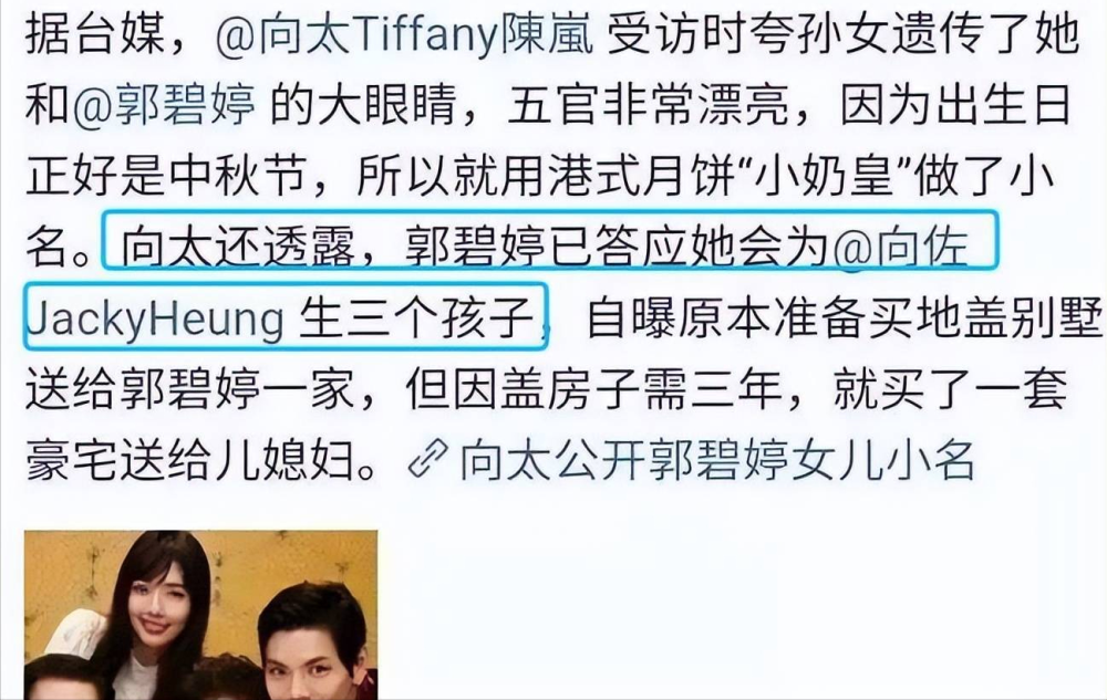 或许豪门这两个字,无论对错都会被赋上争议色彩。 早在今年5月的时候,向太陈岚直接官宣了儿媳郭碧婷怀有二胎的消息,且6月份临盆在即,开心的她还大方透露郭碧婷怀的是一个男孩子,自己随时都准备好了送给儿媳和孙子的大礼。 |