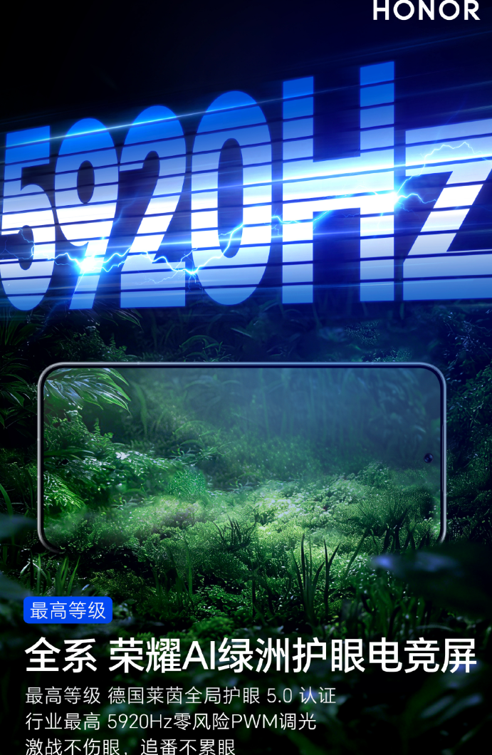 这个问题其实也是解决了长时间追番追剧的朋友,因为看视频内容,一样会长时间注视屏幕。 尤其是有些朋友的使用场景可能是在一些灯光比较昏暗的场所,比如说像KTV包房聚会时,和朋友一起线下开黑。 这种情况就更加考验手机的护眼功能了,毕竟灯光昏暗+全神贯注,往往就是伤眼的高频场景。 在荣耀WIN系列上,搭载了荣耀AI绿洲护眼屏,支持5920Hz的零风险PWM调光。即使是长时间看屏幕或者极端的夜间场景,也能极大程度地缓解眼干、眼疲劳等问题。 |