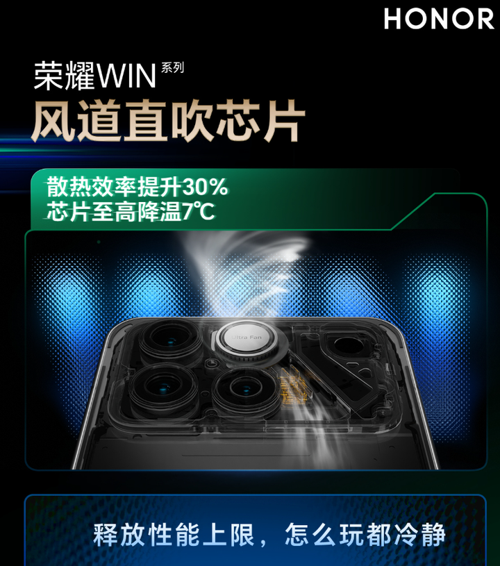 荣耀WIN系列在这方面的解决方案就是非常逆天地搭载了“荣耀东风涡轮散热”,在镜头模组这里搭载了散热模组。通过每分钟25000转的超高速度直吹芯片热源,最高能够直降7度,让旗舰芯片性能持久释放。 在这方面,荣耀WIN系列创新地采用了双360°环绕风扇+直驱极冷风道,直接用最大效率的风+最高效率的直吹芯片,双管齐下将散热效率拉到极限。 哪怕是再极限的场景,荣耀WIN系列也能够确保带来最大的降温效果。 不管是之前的老牌开放世界手游,还是接下来源源不断新登场的手游大作,又或者是长时间户外高温游玩场景,还是追剧、录像,荣耀WIN系列强大的散热效果,绝对拥有同品类产品中最强的散热效果,确保你的手机使用一直“冷静”在高效区间发挥。 左手强性能 右手性能强 想要在游戏中获得最好的游戏体验,性能肯定是游戏体验的重中之重。现在流行一句俗话叫:左拳高伤害,右拳伤害高。这句话改改放在荣耀WIN系列来说就是左手强性能,右手性能强。 |