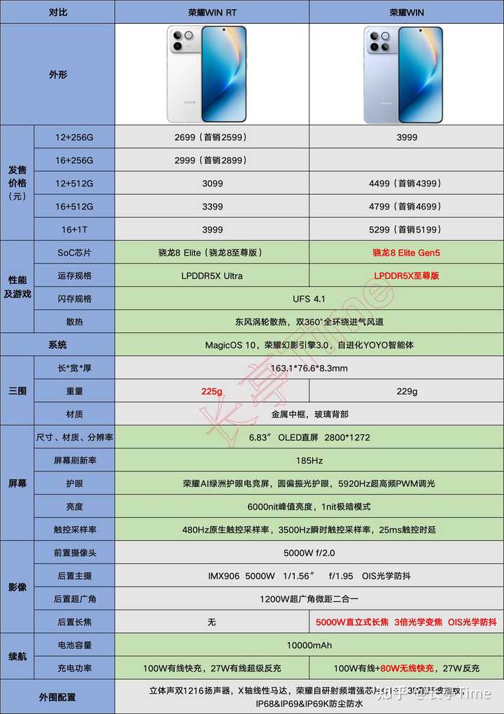 从上面图表可以看到: 荣耀WIN系列两款机型,仅SoC芯片、运存规格、长焦镜头、无线快充4个方面略有不同,再就是荣耀WIN RT机身略轻了3g,其它诸多方面配置完全一致。 两款机型在续航、散热、游戏、护眼等诸多方面的堆料都非常极致,在影像方面与同价格段性能机型相比也完全够用(最明显的槽点,个人觉得应该是没上巨犀玻璃)。 关于荣耀WIN RT 此次两款机型同存储容量前提下,价格相差1300元,单论性价比的话,荣耀WIN RT要更高许多。 毕竟这次主推的东风涡轮散热、10000mAh大电池、185Hz高刷屏等等,荣耀WIN RT一个都没缺席。 其它诸如5920Hz超高频PWM调光、3500Hz瞬时触控采样率、100W有线快充、立体声双1216扬声器、自研射频增强芯片C1+、3D超声波指纹、IP68&IP69&IP69K防尘防水等等,两款机型也是一模一样。 或者我们也可以这么说,荣耀WIN RT各方面的使用体验(尤其游戏和续航这两大卖点),理论上相比荣耀WIN的差距极小,差不多是以70%的价格可以实现95%的使用体验了。 |