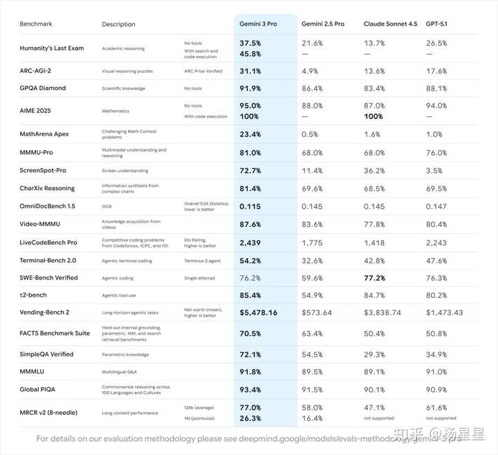 好不好用不知道 简单概括 Gemini 3 Pro 的战绩就是:在榜单上杀疯了,在群聊里被玩坏了。 大家喜闻乐见的各种 AI 测试,Gemini 3 Pro 基本都斩获第一,留下一条 Gemini 3 Pro 专属的色带。 一、不只是"更强" 在"人类最后的考试"中,Gemini 3 Pro拿到了37.5%的正确率,这套题即使是最聪明的人类也只能答对20-30%。 编程能力跃升在LiveCodeBench Pro测试中,Gemini 3 Pro拿到了2,439分的成绩,在所有参测模型中领先。 说白了,Gemini 3 Pro在推理能力、视觉理解、数学思维、代码生成等几乎所有关键能力上,都实现了跨代际的提升。 |