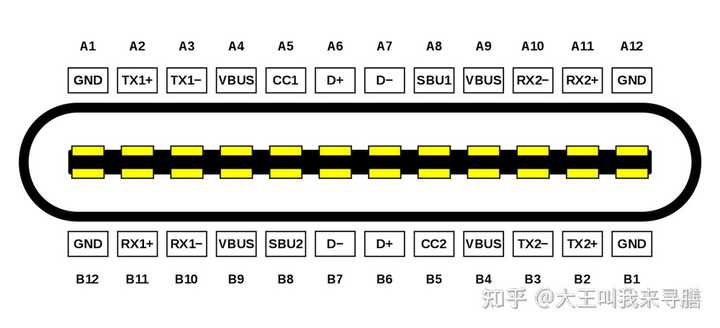 type c有这么多引脚。从引脚定义可以看出,上下两面是中心对称的(即左上和右下一样左下和右上一样,不了解什么是中心对称可以百度),所以可以正反插。 |