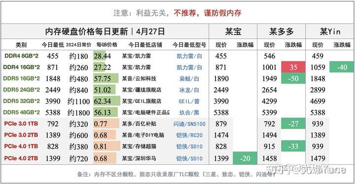 至于现在的价格,大家翻一翻 @Wallace 大佬的显卡日报便知。最新一期(2026年4月27日)截图直接搬运过来,DDR5 32GB*2接近4000,DDR4 16GB*2则接近900。 |