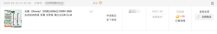 2025年初买的另一对,是DDR4 16GB*2 3600MHz。给老爹装新电脑用了。 |