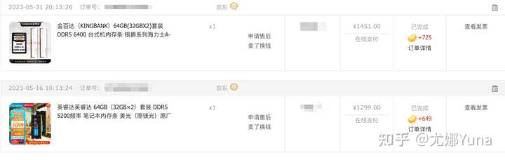 刷到这个问题,尤娜默默的回头翻了翻自己的购物记录…… 2023年中买的两对内存,均为DDR5 32GB*2。上面那对是台式机6400MHz,现在主力机用的依旧是它们;下面那对是笔记本5200MHz,给一个好姐妹(程序员)升级办公机用了。 |