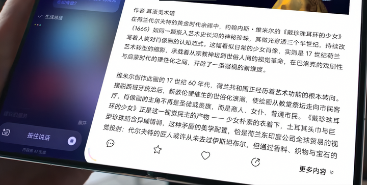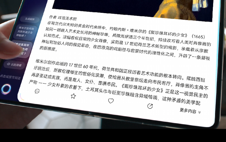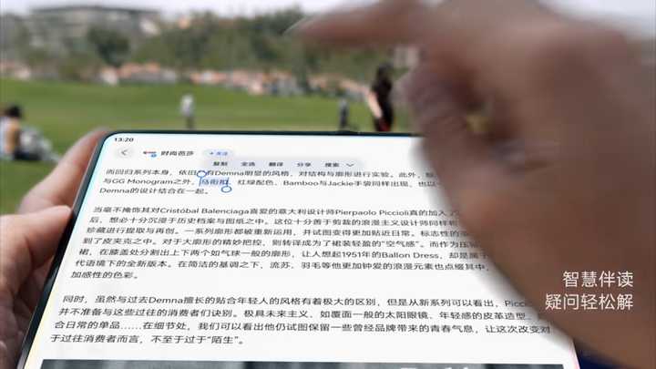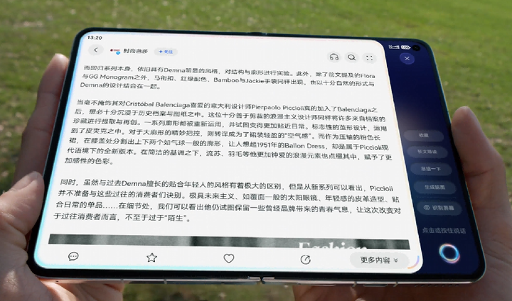 但是在阔折叠上就完全不是这样,能够明显看得到上下两边的黑屏更窄,整体的观看度视觉效果更好。 我之前稍微调研过周围买过折叠屏的用户,询问过他们日常观影的场景,大多数其实都挺朴实的,出差是最高频的场景,比如说要出差了,会提前缓存视频,然后在高铁、飞机上以及到酒店后休息的时候观影。 尤其是在高铁和飞机时,飞机一般也就两小时,刚好可以看完一部缓存的电影,高铁三四个小时可以完成一次连续的追剧体验。 吐槽得最多的地方其实也就是黑边,不过Pura X用户表示体验很好,屏幕比想象中表现得要大。 这也是我说,为什么阔折叠在体验上是全面的升级。 至于阅读这个就不多说了,就拿我自己为例,更宽阔的屏幕带来的是更好的视觉体验,像我这种日常需要刷知乎、微博、财经等消息的自媒体来说,阔折叠的阅读体验是能够给满分的。 阔屏带来的阅读体验最为核心的地方就是大阔折A4纸的比例带来了更大的显示面积,对于我这种需要长文字阅读时,整体屏幕更大,带来了更多的内容量,以及更少的翻页和滑动频率,阅读思维会更连贯。 同时更宽的屏幕让人眼阅读更自然,并且内容区更大,留白更少。我实际体验下来则是文字不挤,行距宽松,长时间阅读更不累。 这点同时在看漫画的时候更有感触,整页显示更加完整,不切条,视野完整。 这点同样在打游戏上也是如此,显示的面积更大,不管是操控还是UI的布局都能够针对性地进行优化,尤其是一些SLG或卡牌游戏,能够更好地看到更多内容。 比如说在《王者荣耀》里,阔屏提升了双指操作区,连击操作的时候更加容易和方便,阔屏大视野能够更早地发现敌人。 开心消消乐则是针对宽屏大图标设计更加护眼,同时游戏内的元素放大,让点击消除更容易。而更多的优化则是在更大的视野区为用户带来更沉浸式体验。 所以说打游戏选华为Pura X Max,能够带来更佳的游戏体验不是吹的。 至于办公、学习,原本阔屏能够带来的全局视野和更多内容展现就不多说了。这次华为Pura X Max还为办公用户带来了手写笔加持的创新功能。 不管是想自由地创作,还是内容剪辑,手绘,文档批注,华为Pura X Max带来的大阔屏都能够带来极致的创作体验。 之前就提到过,折叠屏一个很大的用处就是在于办公场景,尤其是对于一些中层领导,需要审视文件,往往提笔签字。而现在华为Pura X Max所带来的阔屏则是阅读起来更加方便,搭配手写笔后,批注,签字,阅读,都更加方便。 至于其他如需要写文、画画、剪辑视频的朋友,反正就是一句话:更大的屏幕带来的是更好的体验,更沉浸地进行办公。 除此之外,我觉得比较值得一提的就是这次华为Pura X Max搭载了端侧小艺伴随式AI解决方案。可能很多人都不太理解伴随式AI是啥意思。 举个例子,就拿一个大家都日常用到的高频场景来说。比如说你在和朋友微信聊天,忽然他说:“诶,我们约个时间相聚,就1个小时后,在某某场所见面。” 这个时候伴随式AI就会只能识别聊天窗口中的这段待办事项把他加入日程,然后你收拾收拾到时间节点了,小艺会提醒你,到了该出门了。这个时候出门一般无非就是选择打车,或者公交或者自己开车。如果是后两者,小艺给你提供了路线导航,而前者小艺会给你提供一键打车。 这样你就不需要再重新打开打车APP,输入目标地,直接一键打车到目标地。同样,哪怕是选择导航路线,也不再需要通过打开APP再输入导航地址,直接一键导航。 再比如说,你和朋友聊天的时候,他提到了一个新品,在不断地跟你安利。这个时候你切换出去也太磨叽了,这个时候你可以唤出小艺伴随式AI,能够直接提取关键字,自动为你介绍,并且为你提供京东、天猫或者其他APP一键购买的服务,点击跳转,就能一步购买。 最后一个场景,就是如果你像我一样,经常深度沉浸式阅读和浏览讯息的,那么你肯定会有很多关键词的疑问。但是之前的AI都需要切出去,带来非常不便的体验。 而现在伴随式AI则不一样了,得益于Pura X Max超阔的视野,你可以在不影响本体的体验的情况下,边阅读边让AI随时给你提供关键词提取,不懂的地方直接点一下,AI就会为你科普。 很多人其实都会忽略这个功能,但是只要是深度沉浸阅读的朋友应该都知道,这个功能真的是太方便了,不管你是看小说,还是看资料,又或者是一些实时新闻,你永远会发现很多你不懂的东西。 在PC端上还好,你可以打开AI双屏启动,边看边问,不会影响你的体验。问题是,在手机端,因为屏幕的限制,遇到一个问题,你就要切出去找AI问,哪怕是你在同屏打开AI去识别去问,因为屏幕限制也要切出去才能够给你展示。 但是伴随式AI就不一样了,你可以像这样,一边阅读一边看AI给你科普相关的信息。相当于你既能够沉浸地阅读,又有随时随地有一个答疑解惑的老师24小时在你身边,为你解答。 |