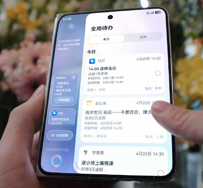 小艺伴随式AI能精准覆盖生活、工作、学习全维度高频场景,比如,自动加入待办事项,并且可以直接取消,还可以加入日历。 也可以识别地点,触发高德地图的打车服务。 |
