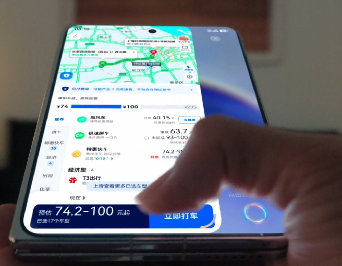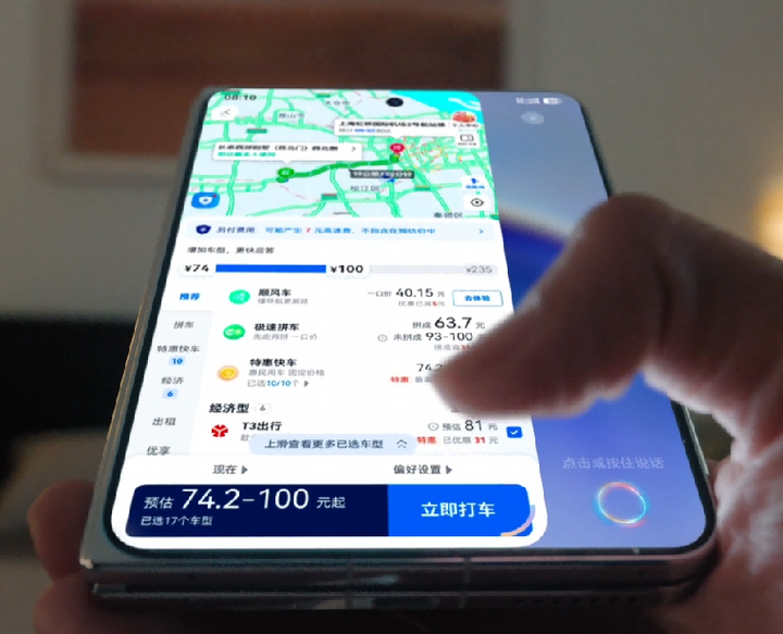 非常细节的点是,小艺伴随式AI不仅提供了一键打车的选项,而且还有更改路线的快捷按键、显示当时道路的拥堵程度。 点击一键打车之后,快速唤醒了高德地图的打车页面。 |