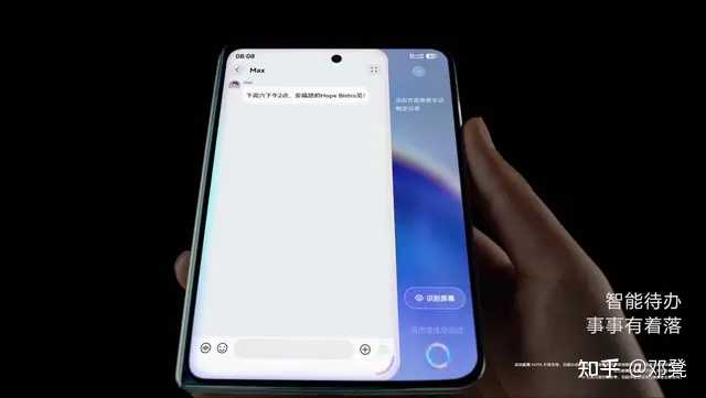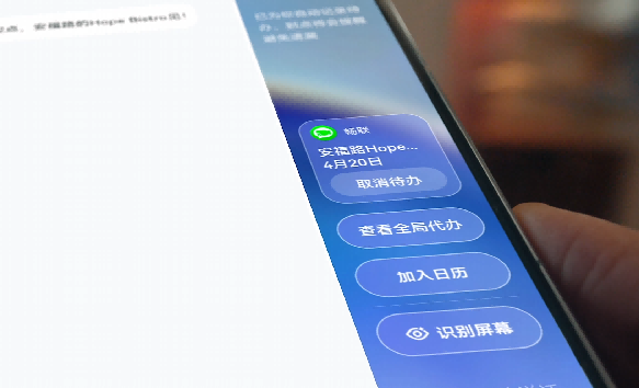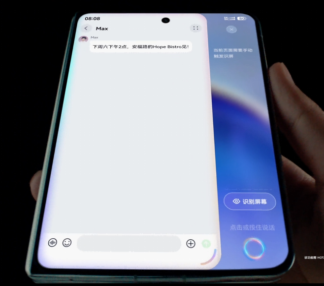 这一段演示其实可以看到,伴随式AI的互动区域集中在右下角,也就是大拇指操作频率最低的地方,最大程度上把可操作的空间让了出来。 后面还演示了一个钉钉的对话场景,展示了更复杂的对话内容的识别摘录。 |