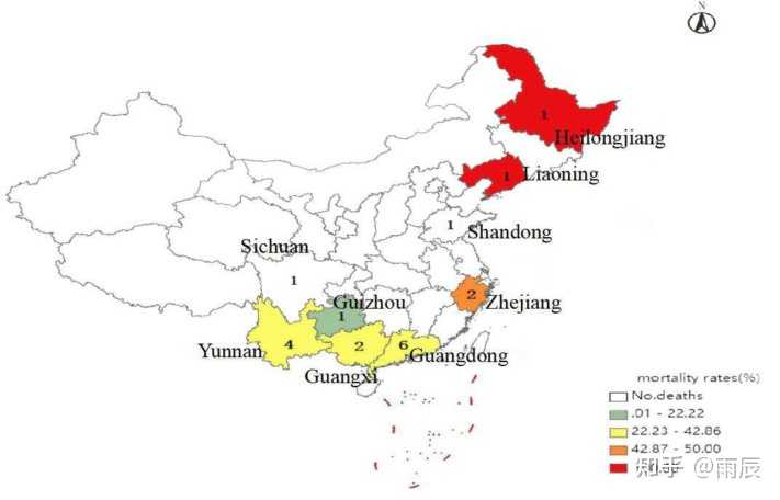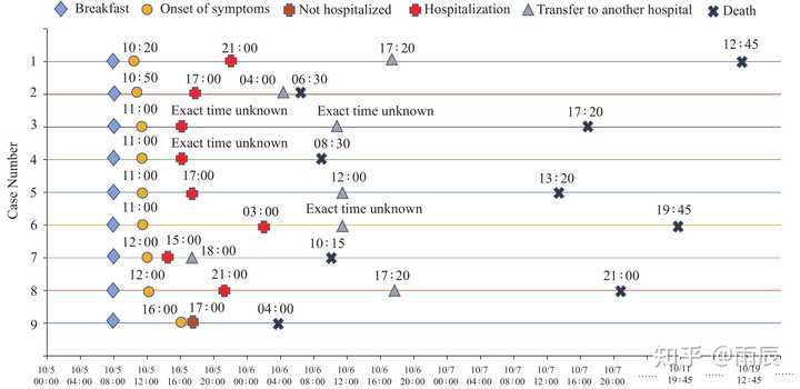 2020年黑龙江省鸡东县食物中毒事件患者病程时序图。doi: 10.46234/ccdcw2020.264 2002-2016年我国共报告此菌引起的食物中毒事件16起,发病153例,死亡51例,病死率为33.33%,多发病于以面制品为主食的地区。 |