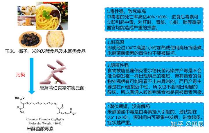 米酵菌酸毒素and唐菖蒲伯克霍尔德氏菌 米酵菌酸是由椰毒假单胞菌酵米面亚种(又称唐菖蒲伯克霍尔德氏菌)产生的毒素,是一种高度不饱和的三羧酸脂肪酸,对热稳定,可耐120 ℃高温,煎、炸、煮、炖这些常规的加热烹调方法都不能破坏它的毒性,脂溶性毒素特征也导致其在体内不容易清除排出。 毒性强,致死率高 中毒者的死亡率高达40%~100%,进食后毒素可立即引起中毒,对肝脏、肾脏、心脏、脑等重要器官均能造成严重的损害。 耐高温 即使经过100℃高温1小时加热或使用高压锅蒸煮,米酵菌酸毒素的毒性也不能被破坏。 隐匿性强 食物被唐菖蒲伯克霍尔德氏菌污染并产毒是不会像食物发霉一样出现明显的霉斑,带有毒素的食物外观很有可能是看不出来异常的,而且产毒主要是在pH值接近中性,所以也不会闻出明显的酸味,所以普通人较难判断食物是否被毒素污染。 潜伏期短,没有解药 米酵菌酸中毒是由毒素摄入引起的,潜伏期在0.5~12小时,短时间内可能集中发病,进食越多,症状越严重。前全球范围内没有任何针对米酵菌酸的特效解毒剂或拮抗剂。 |