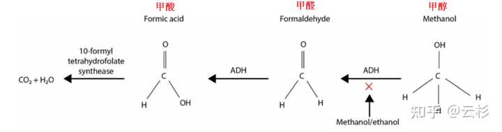另外一方面,甲醇代谢的甲酸,能够在体内广泛分布,而不是局限于某个器官,所以想定向清除,难度也很大。 那怎么办? 前面说了,甲醇对人无毒,有毒的是它经ADH转化为的甲酸。 真正的酒精,乙醇,也是通过ADH转化成乙酸。 而且,乙醇对ADH的亲和力是甲醇的20倍,转化效率是甲醇的5倍。 |