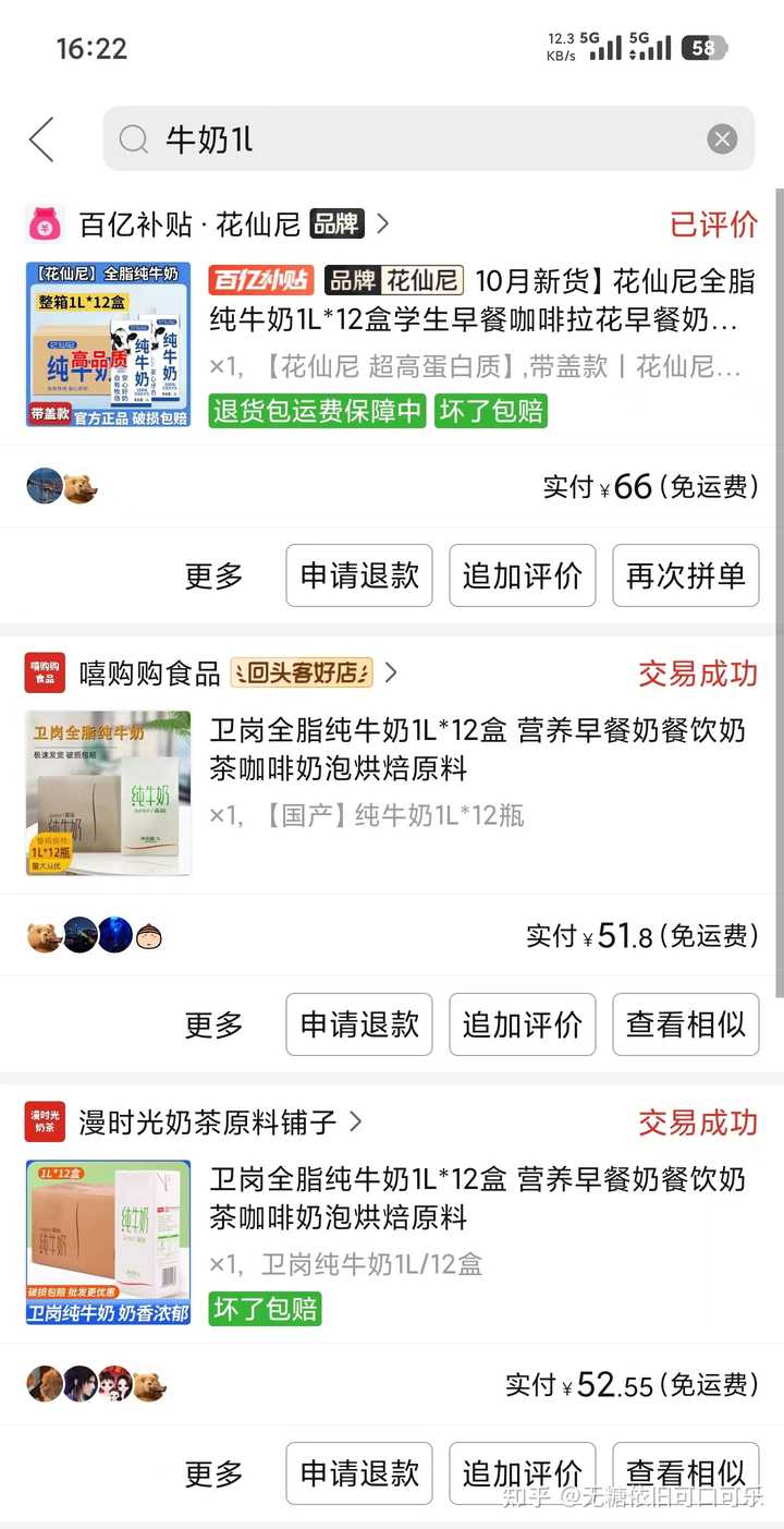 ②多多和京东自营的常温全脂纯牛奶 配料只有生牛乳,执行国标GB25190灭菌乳,蛋白质每100ml含量3.2g及以上的(3.0g含量的很难喝,别买)买的时候一定要注意配料表和执行国标 1L装商用的很便宜,商用的是不带瓶口的,能做到4-5元/L,带瓶口的稍微贵点 都不是临期 我常买的品牌:鲜美赞、卫岗、花仙尼、莫奈花园、慕美花田 需要蹲活动买,如果遇到三人拼团的,可以用其他账号拼了之后再退款也是可以发货的 |
