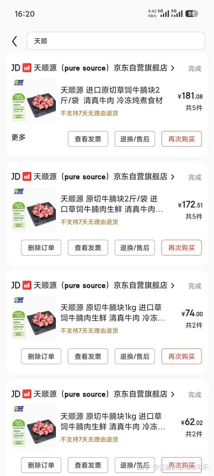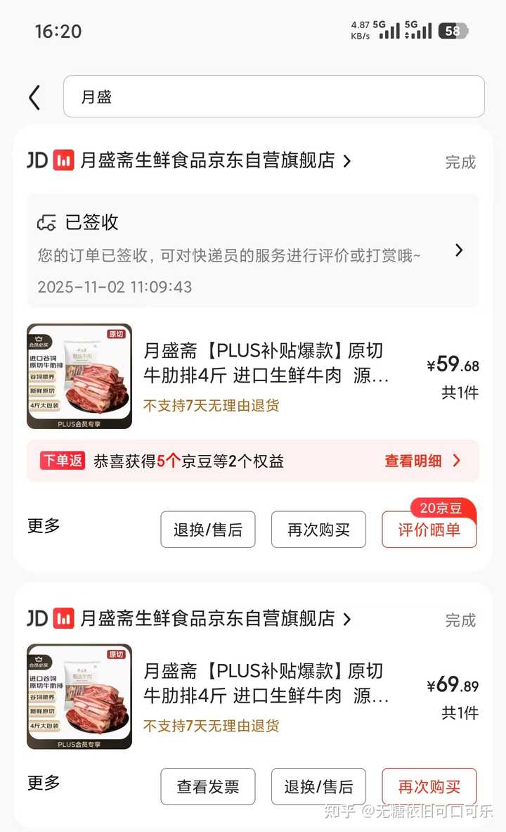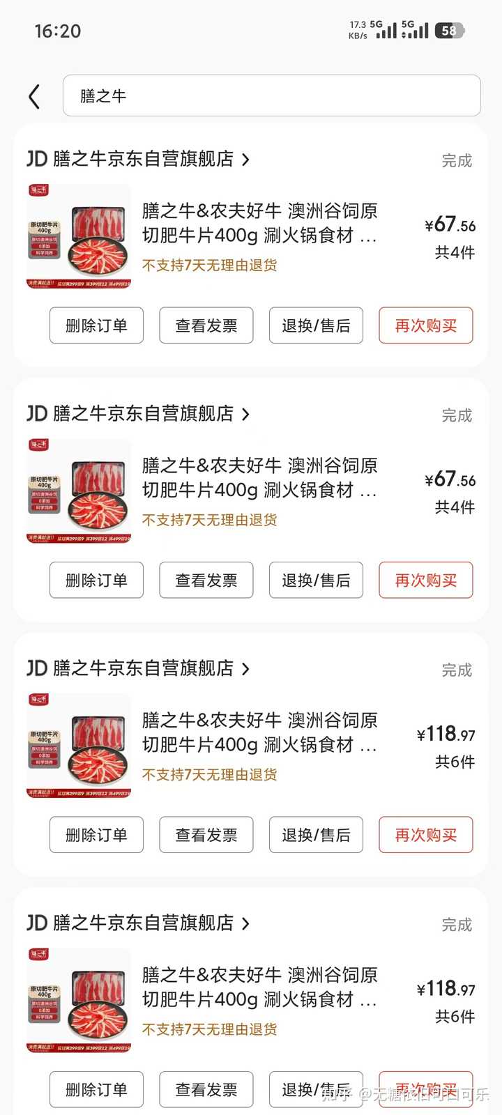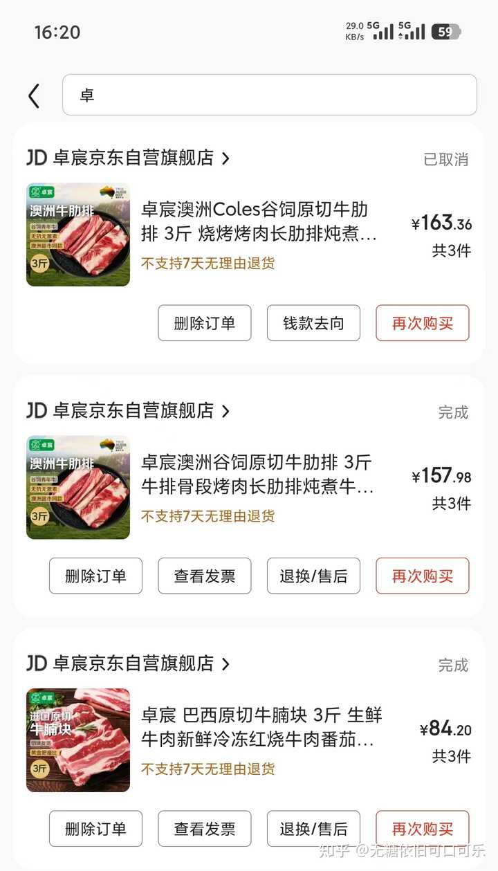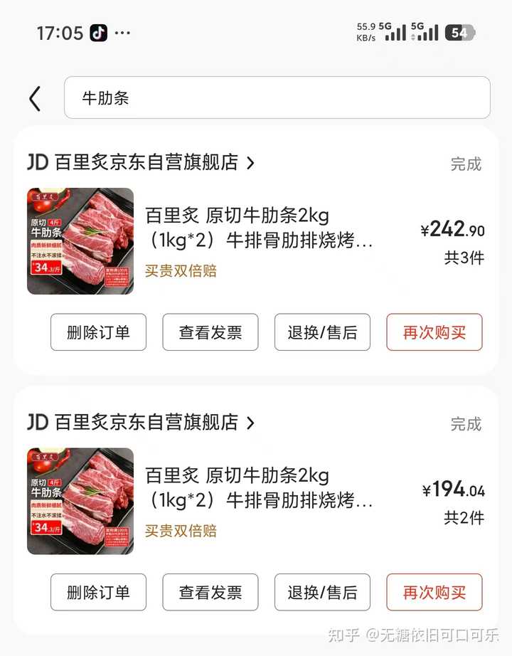 ⑥冷冻牛肉,30元/斤以下,进口的冷冻牛肉很便宜,趁着有活动时候(618、双十一)多屯点放冰箱,保质期有12个月 常买品牌:百里炙、膳之牛(农夫好牛)、月盛斋、卓宸、天顺源、恒都、大庄园 如下,没有科技的原切肥牛17-20元/400g;牛肋排15-18元/斤;牛肋条20元左右/斤;牛腩17-20元/斤; 这些大多都去年买的了,2025年牛肉涨价了,很难买到25元/斤以下的了,遇到30元/斤以下的纯肉 牛腩/牛腱/牛肋条就买吧 线上冷冻牛肉假的太多,尽量到京东自营买 |