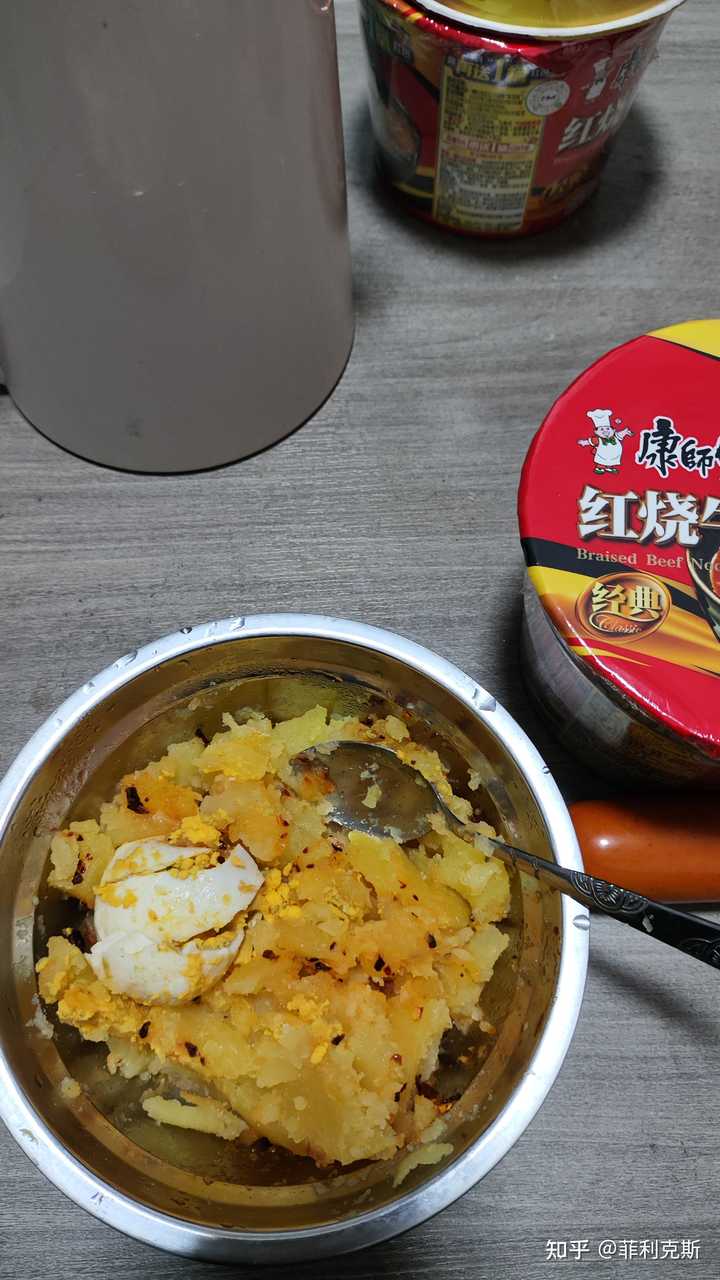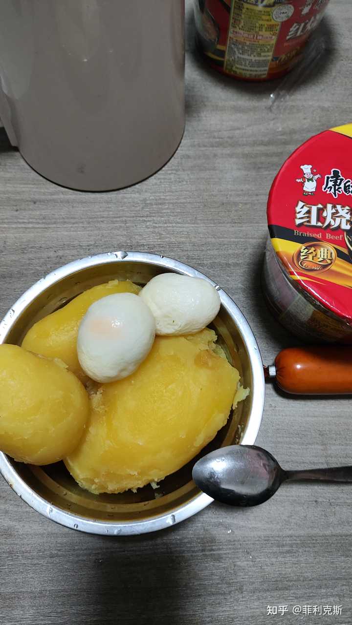土豆+鸡蛋 配比合理的土豆+鸡蛋的组合,生物价是136(鸡蛋是100),其组合比例是64:36(以各自蛋白质总量含量计) 土豆也是营养非常全面的主食(除了维a较少,可以通过猪肝补充,而猪肝也很便宜),土豆+鸡蛋的组合可以覆盖人体绝大部分的营养。具体到这对食物组合,要发挥出最大的蛋白质补充效果,土豆与鸡蛋生重重量比约为8~10:1,因为不同品种的土豆蛋白质含量在2-2.6%之间浮动,所以这个比例也并不固定。如果按照最大的10:1的比例,一个人一天吃2kg(总热量约1600大卡)土豆+200g鸡蛋(约4个,总热量约280大卡),热量可以满足一个普通成年男子的日常消耗,同时补充约75g生物价为136的蛋白质,相当于约100g的生物价为100的蛋白质。 再算一下成本,土豆/鸡蛋网购的话,可以分别做到1元/4元一斤,一天吃2公斤土豆+200g鸡蛋则花费5.6元,含有约100g蛋白质,30g脂肪,350g碳水,是非常廉价健康的低脂高蛋白饮食了。 下班了,回到自己的鼠窝,今晚又是这么一顿简单但不失营养的晚饭,都是提前在电饭煲定好时,回来把土豆和鸡蛋皮剥了再加点油泼辣子,日的一声用勺子压成糊糊,百吃不腻,毕竟要把土豆做难吃也是不容易的。 |