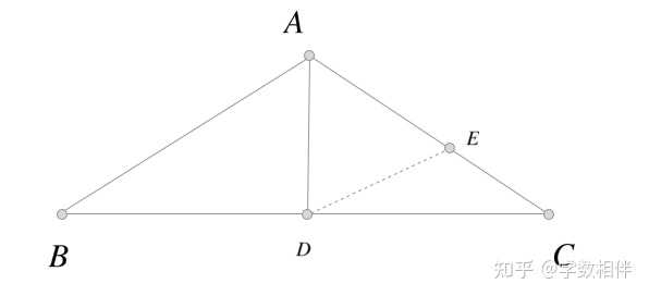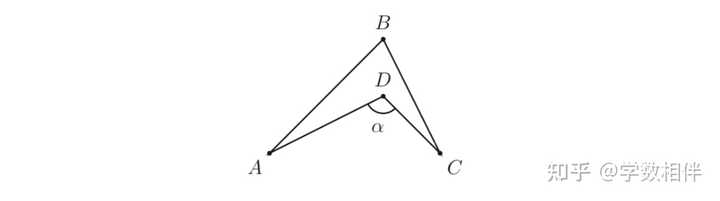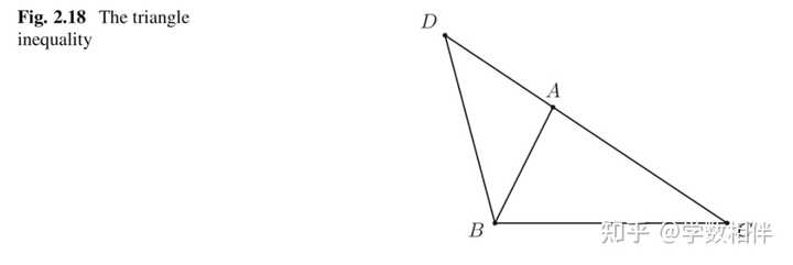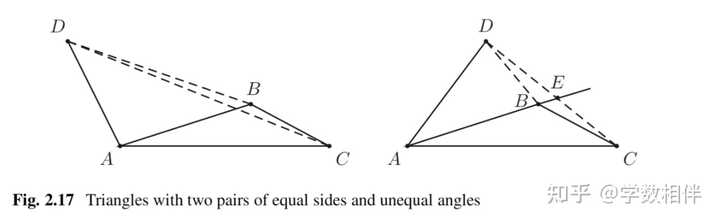 证明: 直线 \overleftrightarrow{AC} 确定了两个半平面,我们选择包含 B 点的那个半平面 \alpha 。 在半平面 \alpha 中取一点 D ,使得 \widehat{DAC} = \widehat{B^\prime A^\prime C^\prime} 且 \overline{AD} = \overline{A^\prime B^\prime} (也就是把两个三角形放在一起,全等)。 很容易利用 SAS 证明 \Delta DAC\cong \Delta B^\prime A^\prime C^\prime ,因此 \overline{DC} = \overline{B^\prime C^\prime} 。 我们只需要证明 \widehat{DBC} > \widehat{B D C} 即可。 而这个时候有两种情况需要考虑: 点 A, D 是位于直线 BC 同侧还是两侧。 (i) 点 A, D 是位于直线 BC 同侧(图2.17左图)。 因为\Delta ABD 是底边为 BD 的等腰三角形,于是就有 \widehat{DBA} = \widehat{BDA} 。 而有 \widehat{DBA}">\widehat{DBC} > \widehat{DBA} , \widehat{BDC} ">\widehat{BDA}> \widehat{BDC} , 因此得证 \widehat{B D C} ">\widehat{DBC} > \widehat{B D C} 。 (ii) 点 A, D 是位于直线 BC 两侧(图2.17右图), 要证明 \widehat{B D C} ">\widehat{DBC} > \widehat{B D C} , 它们两个在同一个三角形中,一个三角形中只能有一个是钝角,所以只需证明前者为钝角即可。设 \overleftrightarrow{AB} 交 CD 于点 E 。 因为\Delta ABD 是底边为 BD 的等腰三角形,因此可得到 \widehat{DBE} > 90^\circ 为钝角。 而 \widehat{DBE} ">\widehat{DBC} = \widehat{DBE} + \widehat{EBC} > \widehat{DBE} , 更是钝角。 # 23. 三角形不等式 定理2.26: 任何三角形中,两边之和大于第三边。 |