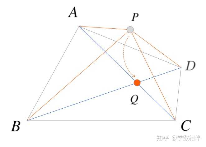 5) 若 a,b,c 为某三角形的三边长,求证 a,b,c 为某三角形的三边长,证明 c^3">a^3 + b^3 + 3abc > c^3 。 c(a^2-ab+b^2) = c[(a+b)^2 - 3ab] \\&> c(c^2 - 3ab) \end{aligned}\\">\begin{aligned} a^3 + b^3 &= (a+b)(a^2 - ab + b^2) \\&> c(a^2-ab+b^2) = c[(a+b)^2 - 3ab] \\&> c(c^2 - 3ab) \end{aligned}\\ 7) 给定凸四边形 ABCD , 证明平面内点 P: \overline{PA}+ \overline{PB}+ \overline{PC}+ \overline{PD} ,使得该和最小的点 P 为该图四边形对角线的交点。 |