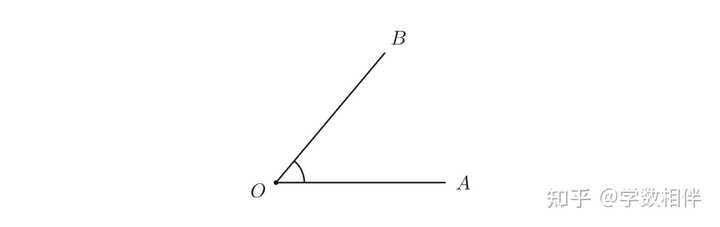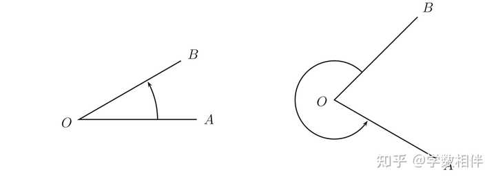 两半平面内的任意两点连线都与这两半平面分割线相交3. 角及角的度量 角(angle, angle region): 设 \stackrel{\rightarrow}{OA}, \stackrel{\rightarrow}{OB} 为平面内两个不同的射线(half-lines),这两条射线将平面分割为两个区域。则称这两个区域之一为顶点(vertex) O 和边(sides) \stackrel{\rightarrow}{OA}, \stackrel{\rightarrow}{OB} 的角或角区域。 |