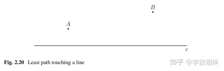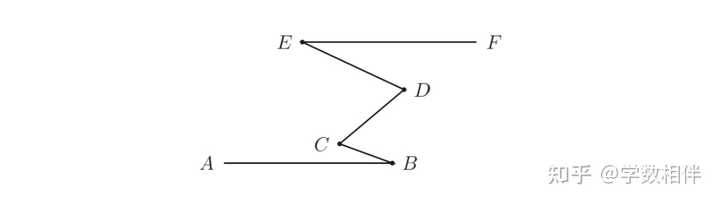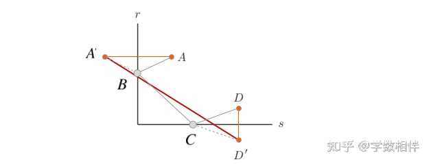 用上面的图来证明,一般情形类似。 考虑 AUG, BGVH, CHI, DWJ, EJXY, FKL 这些凸多边形。 AUG: \overline{AB} + \overline{BG} < \overline{AU} + \overline{UG}\\ BGVH: \overline{BC} + \overline{CH} < \overline{BG} + \overline{GV} + \overline{VH}\\ CHW: \overline{CD} + \overline{WD} < \overline{CH} + \overline{WH}\\ DWJ: \overline{ED} + \overline{EJ} < \overline{WD} + \overline{JW}\\ JEYX: \overline{FE} + \overline{FY} < \overline{XY} + \overline{XJ}+\overline{JE}\\ YFU: \overline{FA} + \overline{AU} < \overline{FY} + \overline{YU}\\ 左右相加即得证。 10) 如下图所示,射线 r\perp s ,尺规作图绘制点 B\in r, C\in s , 使得 \overline{AB}+\overline{BC} + \overline{CD} 尽可能小。 |