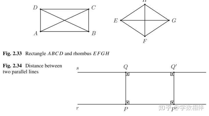 四边形可以分成两个三角形,内角和为360°,因此我们得出结论,当且仅当其四个内角的度量等于90°时,凸四边形是矩形。如果其四条边的长度都相等,则凸四边形就是菱形。图2.33显示了矩形和菱形的示例。 由于矩形的两侧总是平行的(因为它们都垂直于其他两侧),我们得出结论,每个矩形都是平行四边形。另一方面,命题2.31保证每个菱形也是平行四边形。 上述讨论使我们能够定义两条平行线之间的距离。为此,首先注意,如果 r\parallel s 是平行线,那么(参见推论2.18)线 t\perp r ,当且仅当 t\perp s 。 定义2.41: 平行线 r,s 之间的距离(distance)为 PQ, P\in r, Q\in s, \overleftrightarrow{PQ}\perp r,s 。 平行线之间的距离相等,可以由矩形的性质推得。 命题2.43: 平行四边形为矩形当且仅当对角线相等。 |