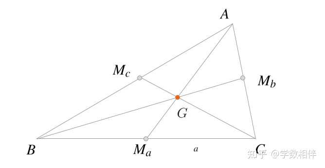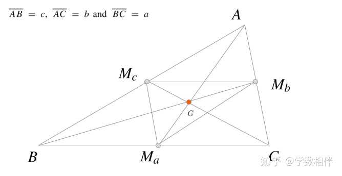 说明: 先构造 \Delta BM_a G , 利用三边长度构造。然后延长 BM_a 为自身两倍得到点 C 。然后延长 M_a G 为自身三倍得到顶点 A 。\Delta ABC 即为所求。 6) 证明任意三角形中, 中线之和小于等于 3p , 大于等于 3p/2 ,其中 p 为半周长。 |
