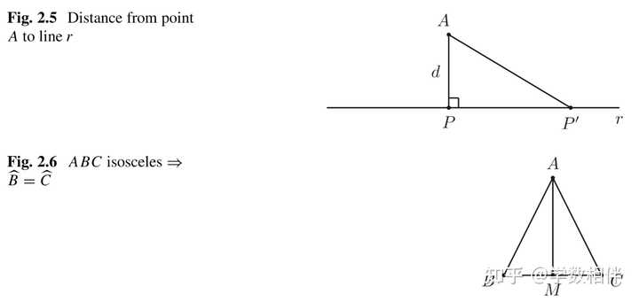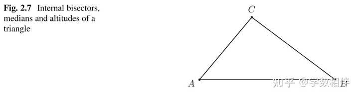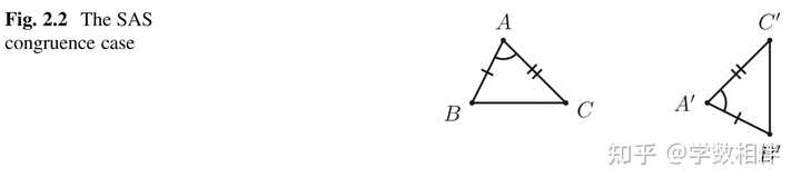 2. 传递性(transitivity): \left. \begin{array}{ll} \Delta ABC\cong \Delta DEF\\ \Delta DEF\cong \Delta GHI \end{array} \right\} \implies \Delta ABC\cong \Delta GHI\\3. 反身性(reflexivity): 当然 \Delta ABC\cong \Delta ABC , 这个是自然的,三角形与自身全等。 这就是关于等价关系需要满足的三条性质,全等是三角形中的一种等价关系。 三角形全等,记作 ABC \equiv A^\prime B^\prime C^\prime, ABC\cong A^\prime B^\prime C^\prime\\ 对应顶点 A\leftrightarrow A^\prime, B\leftrightarrow B^\prime, C\leftrightarrow C^\prime\\ 9. 边角边情形 有了全等的定义,我们需要给出一些方便应用的判别三角形全等的情形集合: 三角形全等情形(cases of congruence of triangles)。 首先来介绍第一种,边角边情形。 公理2.3(SAS全等情形): 如果两个三角形的两条边以及它们的夹角对应相等,那么这两个三角形全等。 \begin{aligned}\begin{equation} \left . \begin{aligned} \overline{AB}=\overline{A^\prime B^\prime}\\ \overline{AC}=\overline{A^\prime C^\prime}\\ \widehat{A} = \widehat{A^\prime} \end{aligned} \right\}\stackrel{SAS}{\implies} ABC\cong A^\prime B^\prime C^\prime \end{equation}\end{aligned}\\ 对应顶点: A\leftrightarrow A^\prime, B\leftrightarrow B^\prime, C\leftrightarrow C^\prime 。那么就可以得到: \widehat{B} = \widehat{B^\prime}, \widehat{C} = \widehat{C^\prime}, \overline{BC} = \overline{B^\prime C^\prime}\\ 10. 角边角情形 公理2.5(ASA全等情形): 如果两个三角形的两个角以及两个角所夹的边对应相等,则这两个三角形全等。 \begin{aligned}\begin{equation} \left . \begin{aligned} \widehat{A} = \widehat{A^\prime}\\ \overline{AB}=\overline{A^\prime B^\prime}\\ \widehat{B} = \widehat{B^\prime} \end{aligned} \right\}\stackrel{ASA}{\implies} ABC\cong A^\prime B^\prime C^\prime \end{equation}\end{aligned}\\ 对应顶点: A\leftrightarrow A^\prime, B\leftrightarrow B^\prime, C\leftrightarrow C^\prime 。那么就可以得到: \widehat{C} = \widehat{C^\prime}, \overline{AC} = \overline{A^\prime C^\prime}, \overline{BC} = \overline{B^\prime C^\prime}\\ 11. 边边边情形 公理2.7(SSS全等情形): 如果两个三角形对应的三条边相等,那么这两个三角形全等。 \begin{aligned}\begin{equation} \left . \begin{aligned} \overline{AB}=\overline{A^\prime B^\prime}\\ \overline{BC}=\overline{B^\prime C^\prime}\\ \overline{CA}=\overline{C^\prime A^\prime}\\ \end{aligned} \right\}\stackrel{SSS}{\implies} ABC\cong A^\prime B^\prime C^\prime \end{equation}\end{aligned}\\ 对应顶点: A\leftrightarrow A^\prime, B\leftrightarrow B^\prime, C\leftrightarrow C^\prime 。那么就可以得到: \widehat{A} = \widehat{A^\prime},\widehat{B} = \widehat{B^\prime},\widehat{C} = \widehat{C^\prime}\\ 值得注意的是,ASA和SSS全等情况可以由SAS情况推出,在下列意义下: 给定平面上的两个三角形,可以证明ASA或SSS的有效意味着这两个三角形满足SAS。 但是这里只是做下说明,忽略掉也没有任何问题。 我们还有推论2.22以及问题1中介绍的三角形全等的另外两个情况,这些情况都可以从 ASA, SSS 情形推导出来。 最后说明一点,如果两个三角形全等,并且不会产生混淆的情况下,我们可以省略它们顶点之间的对应关系。当然为了理解,我们每次都最好建立三角形全等检查时隐含的顶点对应关系。 2.2 全等应用12. 角平分线 角平分线(bisector): 给定一个角 \angle AOB , 它的角平分线就是射线 \overrightarrow {OC}: \ \widehat{AOC} = \widehat{BOC} 。 或者说 \overrightarrow {OC}\ \mathrm{bisects}\ \angle AOB\iff \widehat{AOC} = \widehat{BOC}\\ 假设角平分线存在,则唯一(不做证明)。 三角形 ABC 内角平分线(internal bisector)的概念: 就是对应的三个内角的角平分线与对边交点之间的线段称为内角平分线,三角形内角平分线对应三个顶点或三条边有三个内角平分线。 13. 线段中点 三角形中线(median): 三角形 ABC 三个顶点与对边中点的连线称为三角形的中线,三角形有三条中线。 14. 垂线 平面内两条线段垂直(perpendicular): 平面内两条直线 r,s 如果交于一点,并且在该点形成一个 90^\circ 的角,则称这两条直线垂直,记作 r\perp s 。 垂足(foot of perpendicular): 在 A\not\in r 的情形中, s\perp r, A\in s , 则 s,r 交点称为 A 到 r 的垂线的垂足。 备注2.12: 给定平面内的点 A 和直线 r ,则过 A 且垂直于 r 的直线唯一。 直线 r 外的点 A 到直线 r 的距离(distance)就是 \overline{AP} , 其中 P 即对应点 A 关于直线 r 的垂足。 后面我们会得到一个结论: 点 A 与直线 r 上的点构成的线段中垂线段最短。 三角形的高线(height, altitude): 顶点和对边垂足之间的线段称为高线。 |