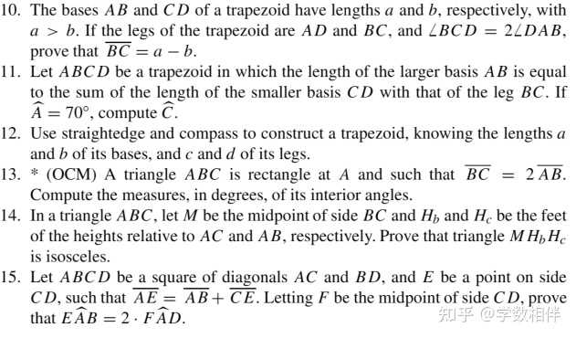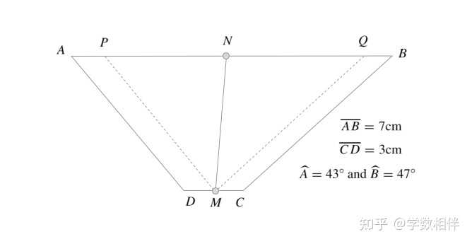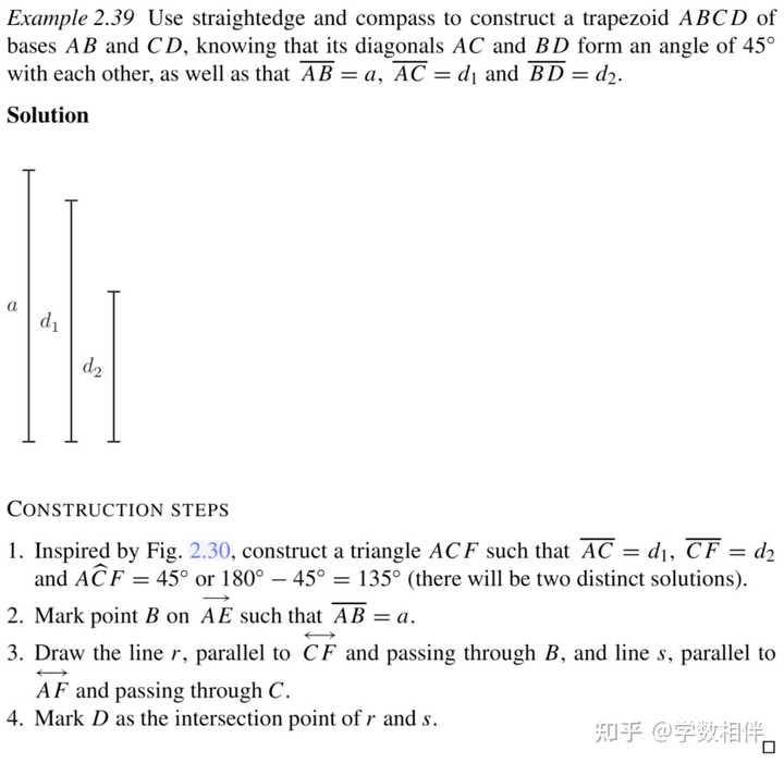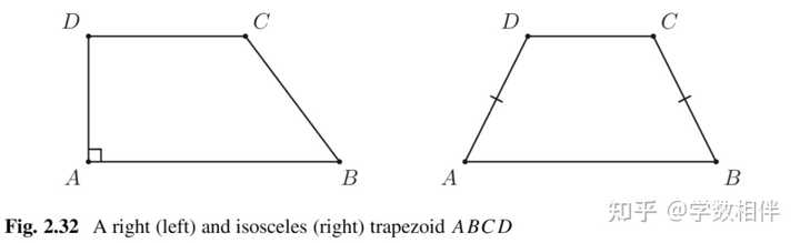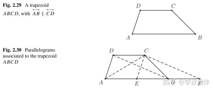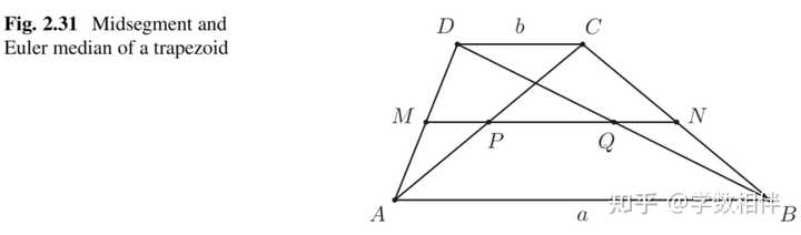 梯形中,平行的两条边称为底边(bases),也就是我们常说的梯形的上底和下底(larger, smaller bases)。另外两条边称为梯形的腰(legs)。 当处理如图2.29所示的梯形 ABCD 中的几何构造问题时,经常可以观察到(参见图2.30),如果 E,F 是线 \overleftrightarrow{AB} 上的点,其中 ADCE, BDCF 是平行四边形,那么: 三角形 BEC : \overline{BE} = \overline{AB} - \overline{CD}, \overline{CE} = \overline{AD} , \widehat{BCE} = 直线 \overleftrightarrow{AD}, \overleftrightarrow{BC} 所形成的夹角。三角形 ACF : \overline{AF} = \overline{AB} + \overline{CD}, \overline{CF} = \overline{BD} , \widehat{ACF} = 直线 \overleftrightarrow{AC}, \overleftrightarrow{BD} 所形成的夹角。31. 欧拉中线 在我们继续之前,我们需要对梯形设置更多的约定,即: 梯形中线: 连接腿中点的线段是梯形的中段。 欧拉中线: 而连接对角线中点的线段则是欧拉中线。 接下来的命题教我们如何根据梯形底的长度计算这些线段的长度。 命题2.40: 梯形 ABCD 的两个底边 AB,CD , 两腰 AD,BC 。设 P,Q 分别为两条对角线 AC,BD 的中点,则: (a) M,N,P,Q 共线,且 \overleftrightarrow{MN} \parallel \overleftrightarrow{AB}, \overleftrightarrow{CD} 。 (b) \begin{aligned}\overline{MN} = \frac{1}{2}(\overline{AB} + \overline{CD}), \overline{PQ} = \frac{1}{2}(\overline{AB} - \overline{CD})\end{aligned} 。 |
