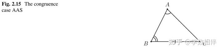 定理2.19也让我们可以根据内角的度量来分类三角形。因为它能保证在一个三角形中,只有一个内角大于等于 90^\circ 。我们只需要利用反证法即可证得。 锐角三角形(acute triangle)有三个锐角。直角三角形(right triangle)只有一个直角。钝角三角形(abtuse triangle)只有一个钝角。直角三角形,直角对边称为斜边(hypotenuse), 直角边称为腿(legs)。21. 角角边情形 推论2.22(AAS全等情形): 两个内角及其中一个角的对边对应相等的两个三角形全等。 |