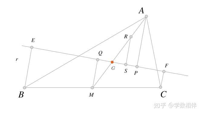 4) 设 \Delta ABC 的重心 G , 设过 G 的直线 r 将顶点 A 和 B,C 分割在直线两侧,求证 A 到 r 的距离等于 B,C 到 r 的距离之和。 |