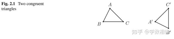 一般称凸多边形 A_1A_2\cdots A_n 为凸n-gon,具有n条边和n个顶点。 四边形(quadrilateral): n=4 。 五边形(pentagon): n=5 。 六边形(quadrilateral): n=6 。 七边形(heptagon): n=7 。 八边形(octagon): n=8 。 十边形(decagon): n=10 。 同样用大写字母 AB, BC, CD,DA 这些表示边。 命题1.12: 每个凸n-gon刚好有 \begin{aligned}\frac{n(n-3)}{2}\end{aligned} 条对角线。 证明: 三角形没有对角线, \begin{aligned}n=3: \frac{n(n-3)}{2} =0\end{aligned} , 无需证明。 对于 n\geq 4 , 我们可以连接 A_1 到其他的 n-1 个顶点 A_2, \cdots, A_n , 得到 n-1 条线段, 其中有两条 A_1A_2, A_1 A_n 为两条边,那么剩下的 n-3 条线段都是对角线( A_1A_3, \cdots, A_1A_{n-1} )。 因此对于任意一个顶点来说,我们都有 n-3 条对角线,于是将这些加起来就得到 n(n-3) 条线段,但是其中任意一条对角线都被重复计算两次,于是就得证结论。 第二章: 全等三角形 本章主要介绍三角形视为相同的充要条件集,从某种意义上来说,很快就会变得精确。在本章还讨论了欧氏几何的第五公理(平行公理),以及它的几个有趣的、重要的结论。其中最著名的是三角不等式。本章最后还介绍了集中特殊类型的四边形。 2.1 全等情形8. 全等概念 三角形等价(equivalence): 这是关于三角形中的等价关系,我们有特殊的名字,称为全等(congruence)。 全等三角形: 两个三角形,移动其中一个三角形的位置,保持不让其变形,如果能和第二个三角形完全重合,那么就称这两个三角形全等。这里的不变形移动包括: 平移、旋转、翻转等动作。 全等三角形具有顶点对应关系、边对应关系和角对应关系: 全等的两个三角形 ABC, A^\prime B^\prime C^\prime ,存在顶点的对应关系: A\leftrightarrow A^\prime, B\leftrightarrow B^\prime, C\leftrightarrow C^\prime\\ 因此也存在对应边和对应内角的相等: \left\{ \begin{array}{ll} \widehat{A} = \widehat{A^\prime}, \widehat{B} = \widehat{B^\prime}, \widehat{C} = \widehat{C^\prime}\\ \overline{AB} = \overline{A^\prime B^\prime},\overline{AC} = \overline{A^\prime C^\prime},\overline{BC} = \overline{B^\prime C^\prime} \end{array} \right.\\ 因为全等三角形是关于三角形的等价关系,因此具有等价关系的性质: 对称性(Symmetry): \Delta ABC\cong \Delta DEF\implies \Delta DEF\cong \Delta ABC 。前面的三角形可以移动与后面三角形重合,反过来后面三角形移动也可以与前面的三角形重合。 |