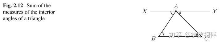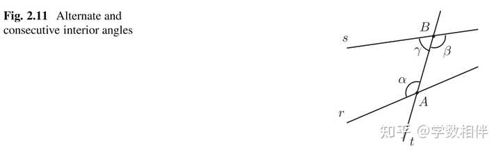 平面内给定三条直线 r,s,t ,使得直线 t 与直线 r,s 分别交于两个不同的点 A,B ,如山图所示。 内错角(alternate interior angles): 比如上图中的角 \alpha,\beta 。 同旁内角(consecutive interior angles): 比如上图的角 \alpha,\gamma 。 推论2.18: 使用上图2.11中的记号, 我们有 r\parallel s\iff \alpha = \beta \iff \alpha + \gamma = 180^\circ\\ 说明: 构造平行线的过程用的是内错角相等。换句话说内错角相等两直线平行。而推论只需要说明同旁内角互补即可说明两直线平行,反之亦然。20. 三角形内角和 |