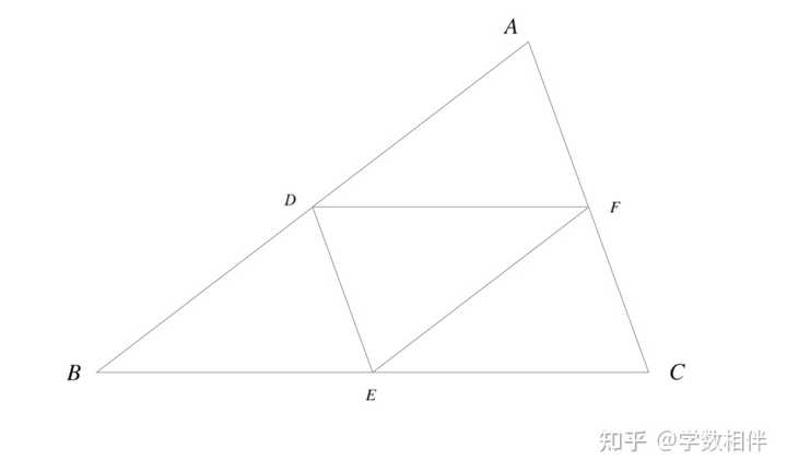 证明: 若 ABCD 为平行四边形, M 为对角线交点,如上图所示。 ASA 可证得 \Delta ABM\cong \Delta CDM , 于是可证得 \overline{AM} = \overline{CM}, \overline{BM} = \overline{DM} 。 反过来,若 ABCD 对角线互相平分,我们可以使用 SAS 证得 \Delta ABM\cong \Delta CDM , 得到 \overline{AB} = \overline{CD} 。同理可得 \overline{BC} = \overline{AD} ,于是得证四边形 ABCD 是平行四边形。 # 28. 三角形中位线(midsegment) 中位线(midsegment): 三角形连接两边中点的线段称为中位线。三角形有三条中位线。 |
