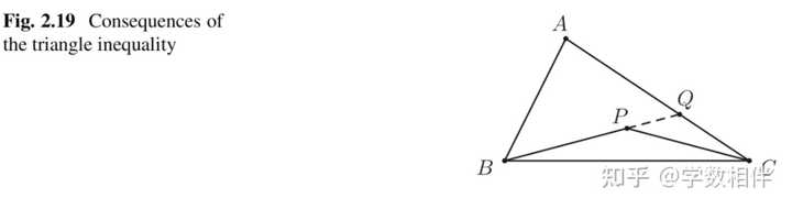 证明: 设 \Delta ABC , 按照之前三角形的符号约定,我们只需要证明 CA 到 D ,使得 \overline{AB}=\overline{AD} ,连接 DB 。 于是就有 \overline{CD} = \overline{CA} + \overline{AD} =b+c 。要证 \overline{BC} < \overline{CD} 。 根据大角和大边关系,我们只需要证明 \begin{aligned}\begin{equation} \left . \begin{aligned} \widehat{DBC} = \widehat{DBA} + \widehat{CBA}\\ \widehat{DBA} = \widehat{BDA} = \widehat{BDC} \end{aligned} \right\}\implies \widehat{BDC} < \widehat{DBC} \end{equation}\end{aligned}\\ 得证。 # 说明: 三角形不等式的常见换元法应用说明。 设 a,b,c 为给定三角形的三条边,那么就可以得到三角不等式 c, a+c > b, b+c>a\\">a+b > c, a+c > b, b+c>a\\ 那么,反过来,如果有三个实数满足上面的不等式关系,那么一定可以构造一个以这三个实数为边长的三角形。 很多情况下,我们三角形换元法的原理就来自这里。 24. 三角形内点不等式 例2.27: 若 P 是三角形 ABC 内的一点,则有 (a) \overline{PB} + \overline{PC} < \overline{AB} + \overline{AC} (b) \overline{PA}+ \overline{PB} + \overline{PC} < \overline{AB} + \overline{AC}+ \overline{BC} |
