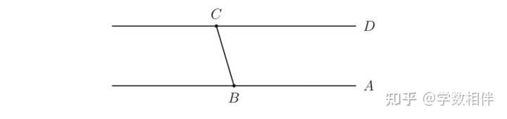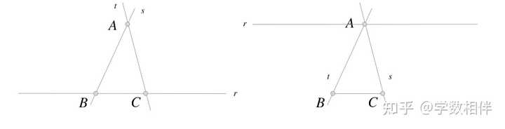 证明: 三角形 ABC ,取 AC 中点 M ,并做射线 BB^\prime 使得 M 为 BB^\prime 的中点。 利用对顶角和 SAS 全等情形,我们很容易证得 \widehat{B^\prime CA} = \widehat{B^\prime CM} = \widehat{BAM} = \widehat{BAC} \\">\widehat{XCA} > \widehat{B^\prime CA} = \widehat{B^\prime CM} = \widehat{BAM} = \widehat{BAC} \\同理我们还可以证明 \widehat{ABC}">\widehat{YCB} > \widehat{ABC} 。 # 18. 平行线公设 欧几里得在《几何原本》中将平行线公设作为第五公设。然而很多数学家,从古典到近代早期,都试图想从其他四个公设来推导这个公设,想把它作为一个定理。但是很可惜,所有都是徒劳。 在19世纪,匈牙利数学家János Bolyai和俄罗斯数学家Nikolai Lobatchevsky独立工作,表明确实有必要将平行作为一个公设。更准确的说,如果承认平行公理,我们就得到欧氏几何;如果不承认平行公理,就得到另一种类型的几何--非欧几何。后者承认过直线外一点可以有无数条直线与该直线平行,比较典型的就是球面的例子。 公设2.17(第五公设): 平面内给定一条直线 r 和给定一个点 A \not\in r , 存在唯一的过该点 A 且平行于该直线 r 的直线。 在尺规作图2.8中我们介绍了一种稍微复杂的绘制平行线的方法,稍后我们还会介绍更简单的绘制平行线的方法。对于两条直线平行,我们记作 r\parallel s 。 19. 内错角和同旁内角 我们有了欧几里德的第五公设,我们就可以得到欧氏几何中的一些重要结论。 |