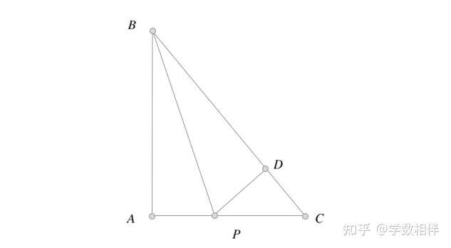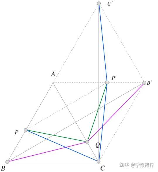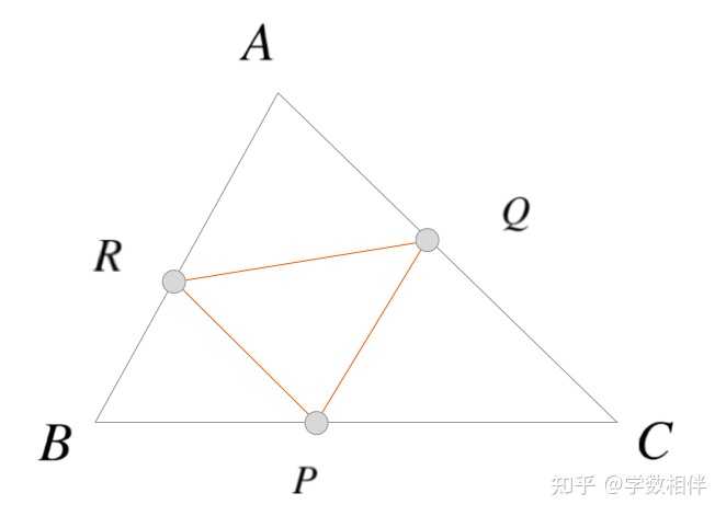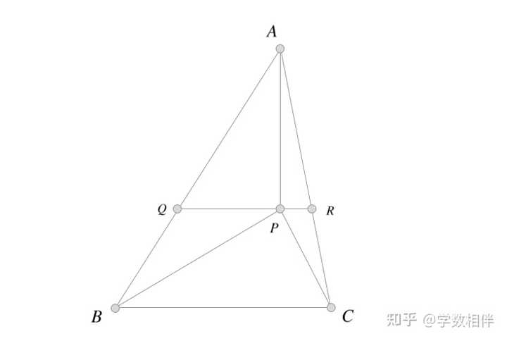 证明: P,P^\prime 关于 AC 对称, B,B^\prime 关于 AC 对称, C,C^\prime 关于 AB^\prime 对称。把 \overline{BQ} + \overline{PQ} + \overline{CP} 长度转换为 \overline{BQ} + \overline{P^\prime Q} + \overline{C^\prime P^\prime} 问题,然后考虑凸四边形 PQP^\prime C^\prime ,三边之和大于第四边,即得证。 12) 设 \Delta ABC: \overline{AB} \geq \overline{AC}\geq \overline{BC} , 给定三角形内部的一个点 P , 证明 \overline{PA} + \overline{PB} + \overline{PC} < \overline{AB} + \overline{AC} 。 |