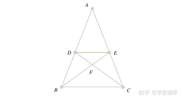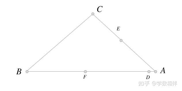 证明: 利用外角定理+内角平分线可以直接证明。 19) \Delta ABC 为底边 BC 的等腰三角形, D,F\in AB, E\in AC 是选定的一些点使得 \overline{BC} = \overline{CD} = \overline{DE} = \overline{EF} = \overline{FA} 。计算 \angle BAC 的度量。 |