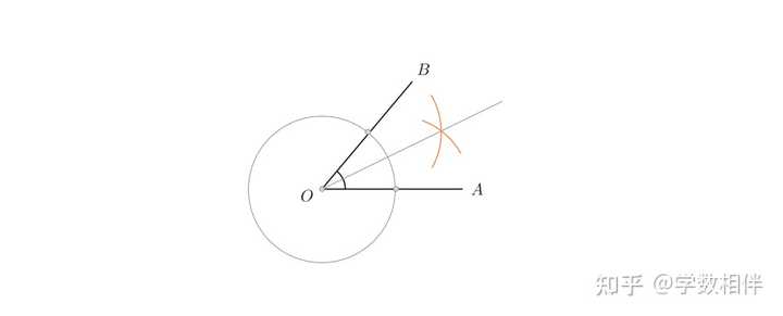 以 O 为圆心绘制半径为任意长度 r 的圆,标记圆与角的两条边的交点 X,Y ,它们分别在射线 \overrightarrow {O A}, \overrightarrow {OB} 上。选择一个长度 \frac{1}{2}\overline{XY}">s > \frac{1}{2}\overline{XY} , 然后分别以 X,Y 为圆心, s 为半径绘制两个圆弧交于点 C (与 O 不重合)。 |