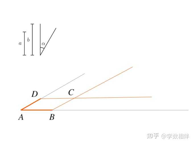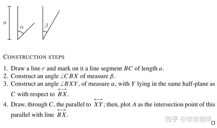 绘制一条直线 r ,在其上取长度为 b 的线段 AB (也可以选择长度为 a , 注意后面对应即可)。构建一个角度为 \alpha 的角 \angle BAX 。然后在射线 \overrightarrow{AX} 上取线段 \overline{AD} = a ,截点为 D 。然后过点 D 绘制平行于 \overleftrightarrow{AB} 的直线,过点 B 绘制平行于 \overleftrightarrow{AD} 的直线,取它们的交点 C 。则四边形 ABCD 即为所求。2.11 角角边绘制三角形 例题2.34: 给定两个角和一条边,绘制三角形。 |