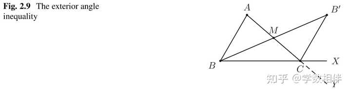 17. 三角形外角不等式 接下来需要了解如何通过直线外一点绘制该直线的平行线。为此(to this end), 我们需要先介绍一下接下来的辅助结论: 外角不等式(exterior angle inequality)。 引理2.15: 三角形外角大于非相邻内角。 |