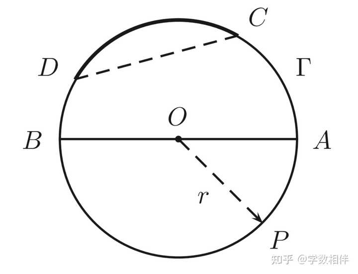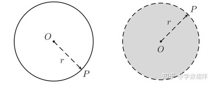 A在直线r上,B不在直线r上 公理1: 两点确定一条直线。比如 r = \overleftrightarrow{AB} , 其中 A,B 为两个不同的点,直线 r 是经过这两个点的唯一直线。 射线(half-line): 直线上任意一个点将直线分成两个半直线,也称为射线,比如记作 \overrightarrow{AB} 。 线段(line segment): 直线 r 上两个不同点 A,B 之间的部分称为线段,记作 \overline{AB} 。 注意上面关于直线、射线、线段的表示方法,分别是用双向箭头、单向箭头和无向上划线。 欧氏平面中两点之间的距离: d(A,B) = \overline{AB} 。 圆: 以点O为中心,半径 0">r>0 的圆是平面内与点O距离为r的所有点的集合,即 \overline{OP} = r 的点集。 一个圆的补集分为两部分区域,有限区域和无限区域。其中有限区域称为圆的内部(interior);无限区域称为圆的外部(exterior)。 圆的内部: \overline{OP} > r ;圆盘(disk): \overline{OP} \leq r 。 |