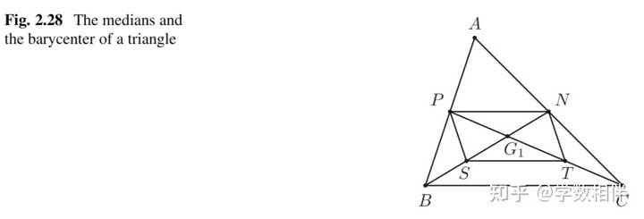 证明: 延长 MN 并取点 M^\prime: \overline{MN} = \overline{NM^\prime} ,如上图所示。 则 \Delta AMN\cong \Delta CM^\prime N(SAS)\implies \overline{M^\prime C}= \overline{MA},\widehat{M^\prime CN} = \widehat{MAN} ,于是 \overleftrightarrow{M^\prime C}\overset{\parallel}{=}\overleftrightarrow{AM} 。 而 \overline{AM}=\overline{MB} , 因此有 \overleftrightarrow{M^\prime C}\overset{\parallel}{=}\overleftrightarrow{MB}\iff MBCM^\prime 为平行四边形。而 \overline{MN} = \overline{NM^\prime} , 因此就有 \overline{MN}\overset{\parallel}{=}\frac{1}{2}\overline{BC}\\ 29. 三角形重心(barycenter) 三角形中线(median): 连接顶点到对边中点的线段称为三角形的中线。三角形有三条中线,三条中线交于一点,这一点称为三角形的重心(barycenter)。关于三条中线交于一点,可以利用平行四边形性质得到。 命题2.38: 三角形三条中线交于一点,这点称为重心。重心将中线一分为两段,比例为2:1。 |