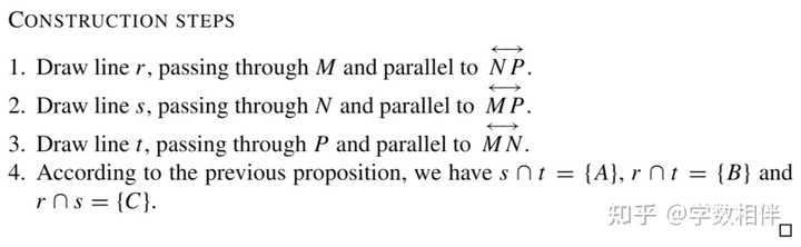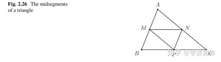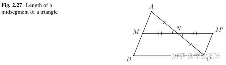 上图展示了三条中位线,其中三角形 \Delta MNP 称作中位三角形(midial triangle)。 命题2.36: 三角形中位线平行于底边且长度为底边的一半。 |