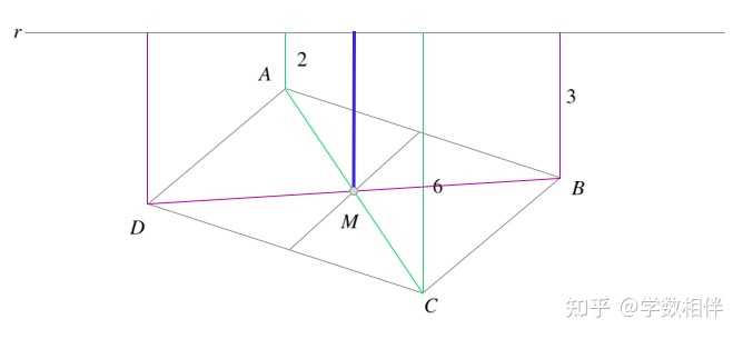 说明: 过下面底边中点 M 分别作 AD, BC 的平行线,则根据条件可知 \widehat{PMQ} = 90^\circ , 因此所求的 \overline{MN} = \frac{1}{2}\overline{PQ} 。 9) 如下图,直线 r 与平行四边形 ABCD 不相交,其中 A,B,C 到 r 距离分别为 2,3,6 ,求 D 到直线 r 的距离。 |