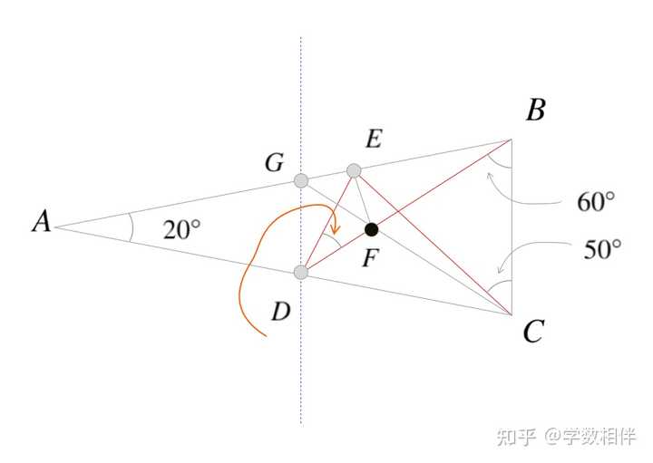 解: 如上图所示,两个答案都是10。可证明 \Delta PRB\cong \Delta PR^\prime B, \Delta QBV\cong \Delta QBV^\prime 。 左图所求实际等于 \overline{RC} , 右图所求实际为 \overline{UV} , 均为腰的高长度。 22) (Soviet Union苏联) 三角形 \Delta ABC 是底边为 BC 的等腰三角形,其中 \widehat{BAC} = 20^\circ 。 D\in AC, E\in AB: \widehat{DBC} = 60^\circ, \widehat{ECB} = 50^\circ , 计算 \widehat{BDE} 。 |