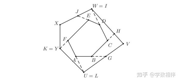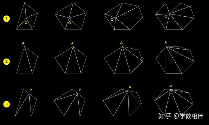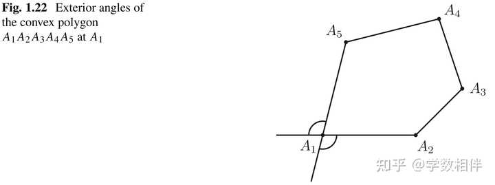 解: 取 X = AB\bigcap CD, Y = AE\bigcap CD , 则 \Delta AXY 中 \angle AXY, \angle AYX 分别是 \Delta XBC 的 X 点、 \Delta YED 的 Y 点对应的外角。根据外角定理,我们知道 \widehat{A} + \widehat{B}+\widehat{C}+ \widehat{D}+ \widehat{E} = 180^\circ 。 11) 给定凸 n 边形,完成下面的项: (a) 证明交于顶点的 n-3 个对角线将这个多边形划分为 n-2 个三角形。 (b) 证明多边形内角和为 180^\circ(n-2) 。 (c) 证明多边形外角和为 360^\circ (一个顶点只算一个角)。 |