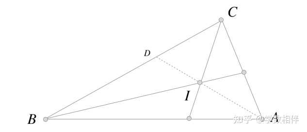 证明: 需要考虑 A\in r, A\not\in r 两种情况。不管哪种情况我们都可以通过反证法来证明。 考虑 A\in r , 存在两条直线 s,t, A\in s,t: s\perp r, t\perp r 。考虑取 B\in s,C\in t , 则 \Delta ABC 内角和大于 180^\circ ,矛盾。 对于 A\not\in r 的情形也是类似。 18) \Delta ABC , I 为内心,即三条内角平分线的交点。 AI 延长交 BC 于 D 。求证 \widehat{ADC} - \widehat{ADB} = \widehat{B} - \widehat{C} 。 |
